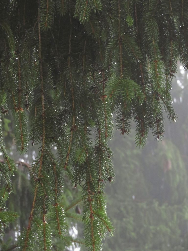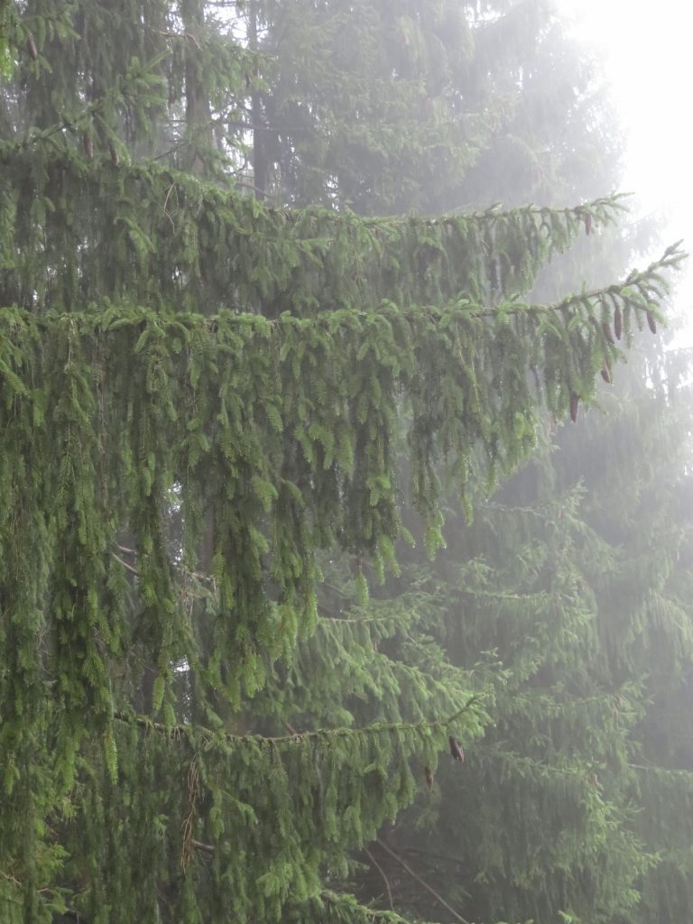 Im Wolkennebel geht die Wassersättigung der Luft gegen 100%. In den herabhängenden Ästen der Fichten sammelten sich die Tropfen, die langsam durch die Schwerkraft nach unten liefen und wenn man in den Wald hineinhörte, tropfte es ohne Unterlass. Obwohl der Wald sich nur Wolkennebel befand, „regnete es quasi im Wald“.