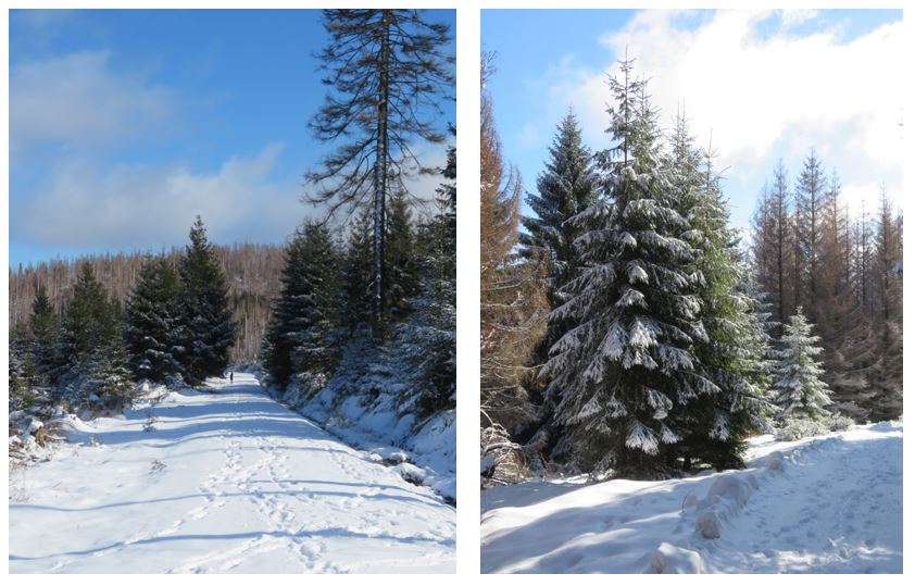 Die folgenden zwei Abbildungen zeigen die gleiche Ansicht (einmal als Foto und einmal als Thermografie). Die Aufnahme entstand bei einer Lufttemperatur von 2 Grad Celsius zwischen Bad Harzburg und Torfhaus um 11:42, bei Windstille.