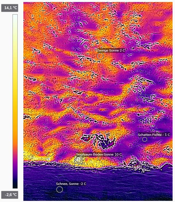 Unterhalb des Baumes ist der Boden sichtbar, denn das herabtropfende Wasser hat den Schnee dort geschmolzen. Durch die Sonne erwärmt sich der Boden auf über 10o C, während der Schnee in der Sonne noch bei – 2o C liegt.